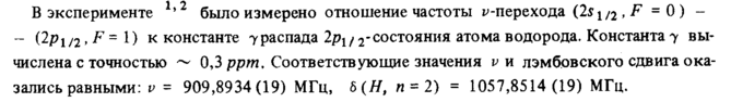 1 2 В эксперименте ' было измерено отношение частоты ^-перехода (2s 1/2 , F =0) -(2pl/2, F = I) к константе 7распада 2рц 2-состояния атома водорода. Константа 7 вычислена с точностью ~~ 0,3 ррт. Соответствующие значения ν и лэмбовского сдвига оказались равными: ν = 909,8934(19) МГц, δ(#, η = 2) = 1057,8514 (19) МГц.