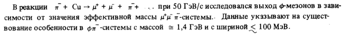В реакции тГ + Си μ+ + μ" + π~+ · при 50 ГэВ/с исследовался выход <£-мезонов в зависимости от значения эффективной массы μ+μ~^-системы., Данные указывают на существование особенности в фтГ-системы с массой ^ 1,4 ГэВ и с шириной^ 100 МэВ.