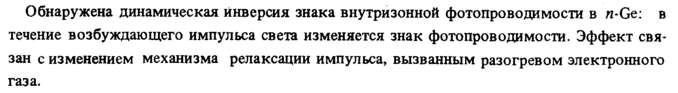 Обнаружена динамическая инверсия знака внутризонной фотопроводимости в я-Ge: в течение возбуждающего импульса света изменяется знак фотопроводимости. Эффект связан с изменением механизма релаксации импульса, вызванным разогревом электронного газа.