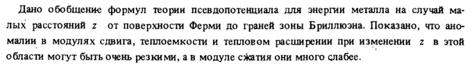 Дано обобщение формул теории псевдопотенциала для энергии металла на случай малых расстояний ζ от поверхности Ферми до граней зоны Бриллюэна. Показано, что аномалии в модулях сдвига, теплоемкости и тепловом расширении при изменении ζ в этой области могут быть очень резкими, а в модуле сжатия они много слабее.