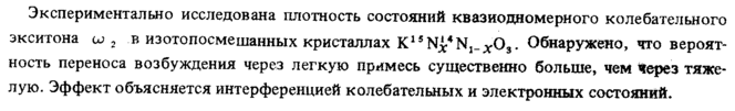 Экспериментально исследована плотность состояний квазиодномерного колебательного экситона ω 2 в изотопосмешанных кристаллах К15 Ν£4Ν,_*0,. Обнаружено, что вероятность переноса возбуждения через легкую примесь существенно больше, чем Через тяжелую. Эффект объясняется интерференцией колебательных и электронных состояний.