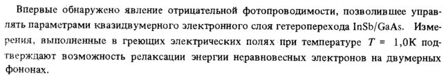 Впервые обнаружено явление отрицательной фотопроводимости, позволившее управлять параметрами квазидвумерного электронного слоя гетероперехода InSb/GaAs. Измерения, выполненные в греющих электрических полях при температуре Τ = Ι,ΟΚ подтверждают возможность релаксации энергии неравновесных электронов на двумерных фононах.