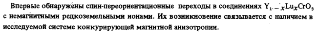Впервые обнаружены спин-переориентационные переходы в соединениях хЬиЛСг03 с немагнитными редкоземельными ионами. Их возникновение связывается с наличием в исследуемой системе конкурирующей магнитной анизотропии.