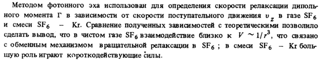 Методом фотонного эха использован для определения скорости релаксации диполь-ного момента Г в зависимости от скорости поступательного движения υ в газе SF6 и смеси SF6 Кг, Сравнение полученных зависимостей с теоретическими позволило сделать вывод, что в чистом газе SF6 взаимодействие близко к V что связано с обменным механизмом вращательной релаксации в SF6 ; в смеси SF6 Кг большую роль играют короткодействующие силы.