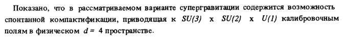 Показано, что в рассматриваемом варианте супергравитации содержится возможность спонтанной компактификации, приводящая к SU(3) χ SU(2) χ Ufl) калибровочным полям в физическом d = 4 пространстве.