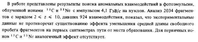 В работе представлены результаты поиска аномальных взаимодействий в фотоэмульсии, облученной ионами 12С и 22Ne с импульсом 4,1 ГэВ/с на нуклон. Анализ 2034 фрагментов с зарядом 2 < ζ < 10, давших 924 взаимодействия, показал, что экспериментальные данные не противоречат существованию эффекта уменьшения средней длины свободного пробега фрагментов на первых сантиметрах пути от места образования. Для первичных ионов 12 С и 2 2 Ne аналогичный эффект отсутствует.
