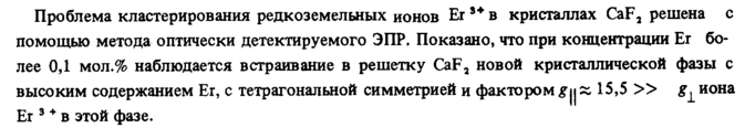 Проблема кластерирования редкоземельных ионов Ег 3* в кристаллах CaF3 решена с помощью метода оптически детектируемого ЭПР. Показано, что при концентрации Ег более 0,1 мол.% наблюдается встраивание в решетку CaFa новой кристаллической фазы с высоким содержанием Ег, с тетрагональной симметрией и фактором £ц& 15,5 » иона Ег 3 + в этой фазе.