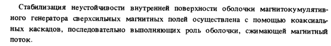 Стабилизация неустойчивости внутренней поверхности оболочки магнитокумулятив-ного генератора сверхсильных магнитных полей осуществлена с помощью коаксиальных каскадов, последовательно выполняющих роль оболочки, сжимающей магнитный поток.