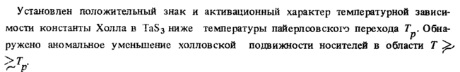 Установлен положительный знак и активационный характер температурной зависимости константы Холла в TaSj ниже температуры пайерлсовского перехода Τ . Обнаружено аномальное уменьшение холловской подвижности носителей в области Τ ^