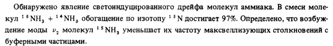 Обнаружено явление светоиндуцированного дрейфа молекул аммиака. В смеси молекул 15 NH3 + 14NH3 обогащение по изотопу 15 N достигает 97%. Определено, что возбуждение моды v7 молекул 15NH3 уменьшает их частоту максвеллизующих столкновений с буферными частицами.