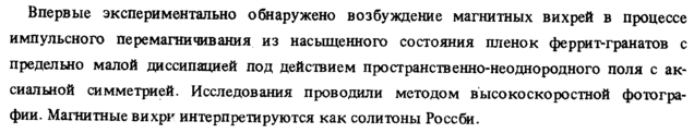 Впервые экспериментально обнаружено возбуждение магнитных вихрей в процессе импульсного перемагничивания из насыщенного состояния пленок феррит-гранатов с предельно малой диссипацией под действием пространственно-неоднородного поля с аксиальной симметрией. Исследования проводили методом высокоскоростной фотографии. Магнитные вихри интерпретируются как солитоны Россби.