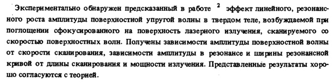 Экспериментально обнаружен предсказанный в работе 2 эффект линейного, резонансного роста амплитуды поверхностной упругой волны в твердом теле, возбуждаемой при поглощении сфокусированного на поверхность лазерного излучения, сканируемого со скоростью поверхностных волн. Получены зависимости амплитуды поверхностной волны от скорости сканирования, зависимости амплитуды в резонансе и ширины резонансной кривой от длины сканирования и мощности излучения. Представленные результаты хорошо согласуются с теорией.