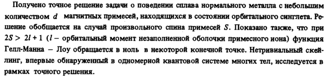 Получено точное решение задачи о поведении сплава нормального металла с небольшим количеством d магнитных примесей, находящихся в состоянии орбитального синглета. Решение обобщается на случай произвольного спина примесей S. Показано также, что при 2S > 21 + 1 ( / орбитальный момент незаполненной оболочки примесного иона) функция Гелл-Манна Лоу обращается в ноль в некоторой конечной точке. Нетривиальный скей-линг, впервые обнаруженный в одномерной квантовой системе многих тел, исследуется в рамках точного решения.