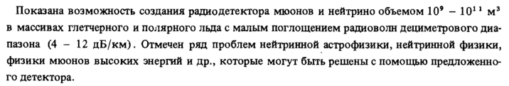 Показана возможность создания радио детектора мюонов и нейтрино объемом 109 1011 м3 в массивах глетчерного и полярного льда с малым поглощением радиоволн дециметрового диапазона (4-12 дБ/км). Отмечен ряд проблем нейтринной астрофизики, нейтринной физики, физики мюонов высоких энергий и др., которые могут быть решены с помощью предложенного детектора.