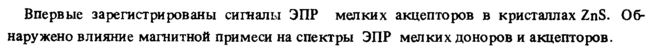 Впервые зарегистрированы сигналы ЭПР мелких акцепторов в кристаллах ZnS. Обнаружено влияние магнитной примеси на спектры ЭПР мелких доноров и акцепторов.