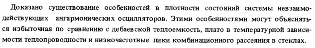 Доказано существование особенностей в плотности состояний системы невзаимодействующих ангармонических осцилляторов. Этими особенностями могут объясняться избыточная по сравнению с дебаевской теплоемкость, плато в температурной зависимости теплопроводности и низкочастотные пики комбинационного рассеяния в стеклах.