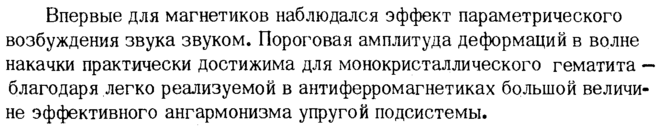 Впервые для магнетиков наблюдался эффект параметрического возбуждения звука звуком. Пороговая амплитуда деформаций в волне накачки практически достижима для монокристаллического гематита — благодаря легко реализуемой в антиферромагнетиках большой величине эффективного ангармонизма упругой подсистемы.