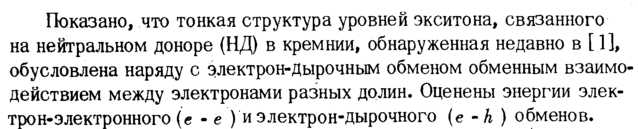 Показано, что тонкая структура уровней экситона, связанного на нейтральном доноре (НД) в кремнии, обнаруженная недавно в [1], обусловлена наряду с электрон-дырочным обменом обменным взаимодействием между электронами разных долин. Оценены энергии электрон-электронного (с -е ) и электрон-дырочного (е h) обменов.
