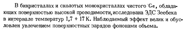 В бикристаллах и сколотых монокристаллах чистого Ge, обладающих поверхностью высокой проводимости, исследована ЭДС Зеебека в интервале температур 1,7 τ 17 К. Наблюдаемый эффект взлик и обусловлен увлечением поверхностных зарядов фононами объема.