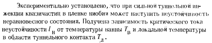 Экспериментально установлено, что при сильной туннельной ин-жекции квазичастиц в пленке ниобия может наступить неустойчивость неравновесного состояния. Получена зависимость критического тока неустойчивости /н от температуры ванны Τ и.локальной температуры в области туннельного контакта Τ .