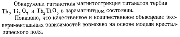 Обнаружена гигансткая магнитострикция титанатов тербия ТЬ2 Tii2 0? и Tb2Ti05 в парамагнитном состоянии. Показано, что качественное и количественное объяснение экспериментальных зависимостей возможно на основе модели кристаллического поля.