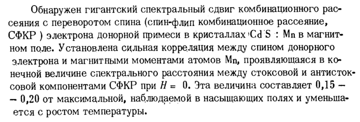 Обнаружен гигантский спектральный сдвиг комбинационного рассеяния с переворотом спина (спин-флип комбинационное рассеяние, СФКР ) электрона донорной примеси в кристаллах >Cd S : Μη в магнитном поле. Установлена сильная корреляция между спином донорного электрона и магнитными моментами атомов Μη, проявляющаяся в конечной величине спектрального расстояния между стоксовой и антистоксовой компонентами СФКР при Η = 0. Эта величина составляет 0,15 -— 0,20 от максимальной, наблюдаемой в насыщающих полях и уменьшается с ростом температуры.