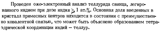 Проведен оже-электронный анализ теллурида свинца, легированного индием при дозе индия >, 1 ат.%. Основная доля введенных в кристалл примесных центров находится в состоянии с преимущественно ковалентной связью, что может быть объяснено образованием тетра-эдрической координации индий — теллур.