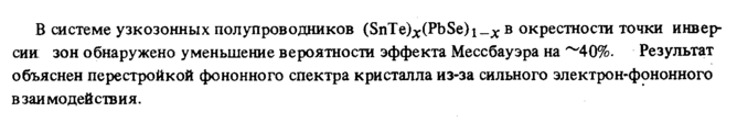 В системе узкозонных полупроводников (SnTe)x(PbSe)i_x в окрестности точки инверсии зон обнаружено уменьшение вероятности эффекта Мессбауэра на ~40%. Результат объяснен перестройкой фоионного спектра кристалла из-за сильного электрон-фононного взаимодействия.