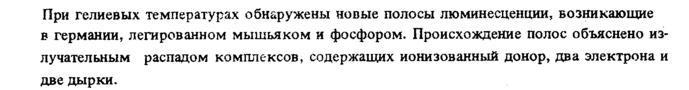 При гелиевых температурах обнаружены новые полосы люминесценции, возникающие в германии, легированном мышьяком и фосфором. Происхождение полос объяснено из-лучательным распадом комплексов, содержащих ионизованный донор, два электрона и две дырки.