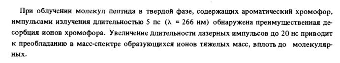При облучении молекул пептида в твердой фазе, содержащих ароматический хромофор, импульсами излучения длительностью 5 пс (λ = 266 нм) обнаружена преимущественная десорбция ионов хромофора. Увеличение длительности лазерных импульсов до 20 не приводит к преобладанию в масс-спектре образующихся ионов тяжелых масс, вплоть до молекулярных.
