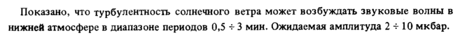 Показано, что турбулентность солнечного ветра может возбуждать звуковые волны в нижней атмосфере в диапазоне периодов 0,5 -г 3 мин. Ожидаемая амплитуда 2 -f 10 мкбар.