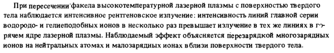 При пересечении факела высокотемпературной лазерной плазмы с поверхностью твердого тела наблюдается интенсивное рентгеновское излучение: интенсивность линий главной серии водородои гелиеподобных ионов в несколько раз превышает излучение в тех же линиях в горячем ядре лазерной плазмы. Наблюдаемый эффект объясняется перезарядкой многозарядных ионов на нейтральных атомах и малозарядных ионах вблизи поверхности твердого тела.