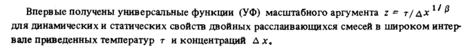 Впервые получены универсальные функции (УФ) масштабного аргумента ζ ~ т/дх 11 & для динамических и статических свойств двойных расслаивающихся смесей в широком интервале приведенных температур г и концентраций Ахе