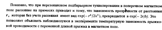 Показано, что при нерезонансном подбарьерном туннелировании в поперечном магнитном поле рассеяние на примесях приводит к тому, что зависимость прозрачности от расстояния г, которая без учета рассеяния имеет вид ехр(~ г2/2\2), превращается в ехр(2r/b). Это позволяет объяснить наблюдавшуюся в эксперименте температурную зависимость прыжковой проводимости с переменной длиной прыжка в магнитном поле.