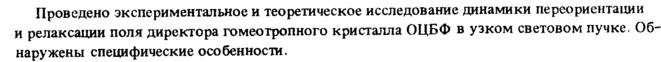 Проведено экспериментальное и теоретическое исследование динамики переориентации и релаксации поля директора гомеотройного кристалла ОЦБФ в узком световом пучке. Обнаружены специфические особенности.