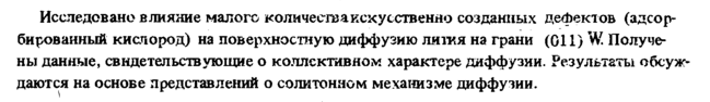 Исследовано влияние малого количеств а искусственно созданных дефектов (адсорбированный кислород) на поверхностную диффузию лития на грани (Gil) W Получены данные, свидетельствующие о коллективном характере диффузии. Результаты обсуждаются на основе представлений о солитонном механизме диффузии.