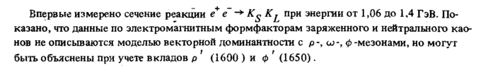 Впервые измерено сечение реакции е+ е при энергии от 1,06 до 1,4 ГэВ. По- казано, что данные по электромагнитным формфакторам заряженного и нейтрального као-нов не описываются моделью векторной доминантности с ρ-, ω-, φ -мезонами, но могут быть объяснены при учете вкладов ρ ' (1600 ) и φ ' (1650).