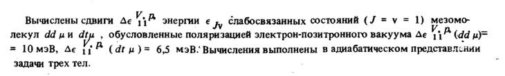 Вычислены сдвиги Де энергии е «· слабо связанны χ состояний (/ = ν = 1) мезомо-лек у л dd μ и dpi , обусловленные поляризацией электрон-пози тронного вакуума Ае \\^ {dd μ)= 10 мэВ, Δ<? ц" (dt μ ) = 6,5 мэВ/ Вычисления выполнены в адиабатическом представлении задачи трех тел.