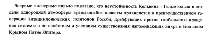 Впервые экспериментально показано, что неустойчивость Кельвина -Гельмгольца в модели однородной атмосферы вращающейся планеты проявляется в преимущественной генерации антициклонических солитонов Россби, дрейфующих против глобального вращения системы и по свойствам и условиям существования напоминающих вихрь в Большом Красном Пятне Юпитера.