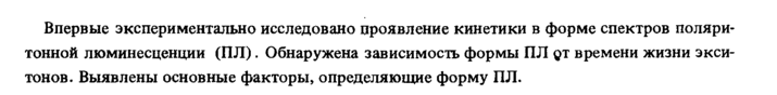 Впервые экспериментально исследовано проявление кинетики в форме спектров поляри-тонной люминесценции (ГШ). Обнаружена зависимость формы ПЛ от времени жизни экси-тонов. Выявлены основные факторы, определяющие форму ПЛ.