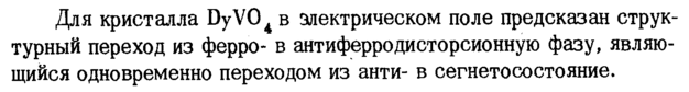 Для кристалла DyV04 в электрическом поле предсказан структурный переход из ферров антиферродисторсионную фазу, являющийся одновременно переходом из антив сегнетосостояние.
