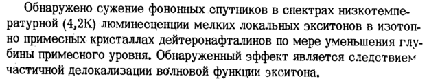 Обнаружено сужение фононных спутников в спектрах низкотемпературной (4,2К) люминесценции мелких локальных экситонов в изотопно примесных кристаллах дейтеронафталинов по мере уменьшения глубины примесного уровня. Обнаруженный эффект является следствием частичной делокализации волновой функции экситона.