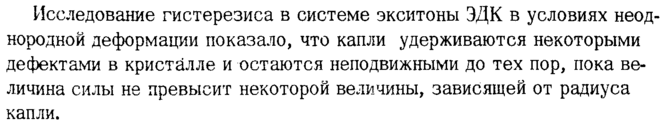 Исследование гистерезиса в системе экситоны ЭДК в условиях неоднородной деформации показало, что капли удерживаются некоторыми дефектами в кристалле и остаются неподвижными до тех пор, пока величина силы не превысит некоторой величины, зависящей от радиуса капли.
