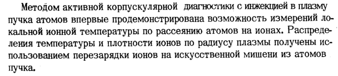 Методом активной корпускулярной диагностики с инжекцией в плазму пучка атомов впервые продемонстрирована возможность измерений локальной ионной температуры по рассеянию атомов на ионах. Распределения температуры и плотности ионов по радиусу плазмы получены использованием перезарядки ионов на искусственной мишени из атомов пучка.