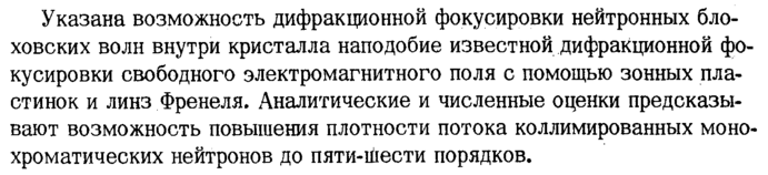 Указана возможность дифракционной фокусировки нейтронных бло-ховских волн внутри кристалла наподобие известной дифракционной фокусировки свободного электромагнитного поля с помощью зонных пластинок и линз Френеля. Аналитические и численные оценки предсказывают возможность повышения плотности потока коллимированных монохроматических нейтронов до пяти-Жести порядков.