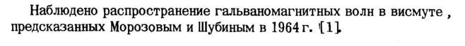 Наблюдено распространение гальваномагнитных волн в висмуте , предсказанных Морозовым и Шубиным в 1964 г. {11
