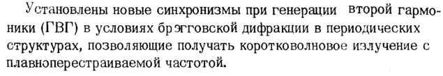 Установлены новые синхронизмы при генерации второй гармоники (ГВГ) в условиях бр эгговской дифракции в периодических структурах, позволяющие получать коротковолновое излучение с плавноперестраиваемой частотой.