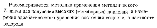 Рассматривается методика применения металлического Z-пинча для получения высоких (мегабарных) давлений и измерения адиабатического уравнения состояния веществ, в частности водорода,