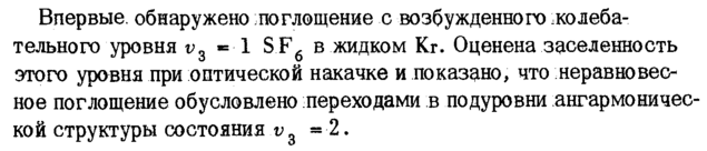 Впервые, обнаружено поглощение с возбужденного колебательного уровня vg = 1 S F6 в жидком Кг. Оценена заселенность этого уровня при оптической накачке и показано, что неравновесное поглощение обусловлено переходами в подуровни ангармонической структуры состояния vz 2.