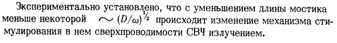 Экспериментально установлено, что с уменьшением длины мостика меньше некоторой (D/ω)/з происходит изменение механизма стимулирования в нем сверхпроводимости СВЧ излучением.